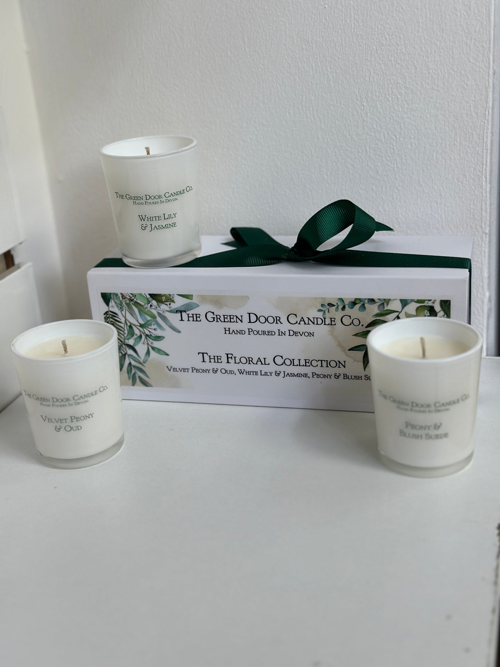 Our Floral Collection Candle Gift Set, consisting of three votive candles beautifully packaged, the perfect gift for a loved one or yourself.